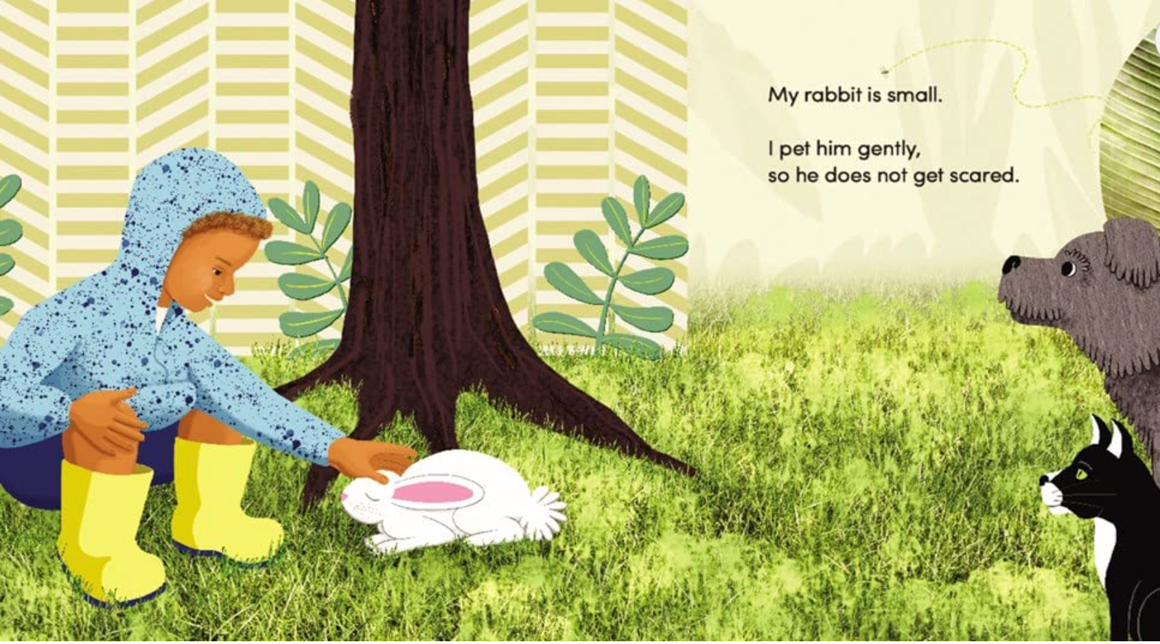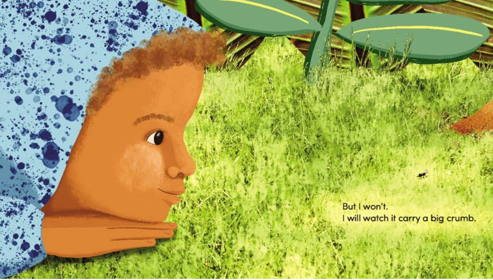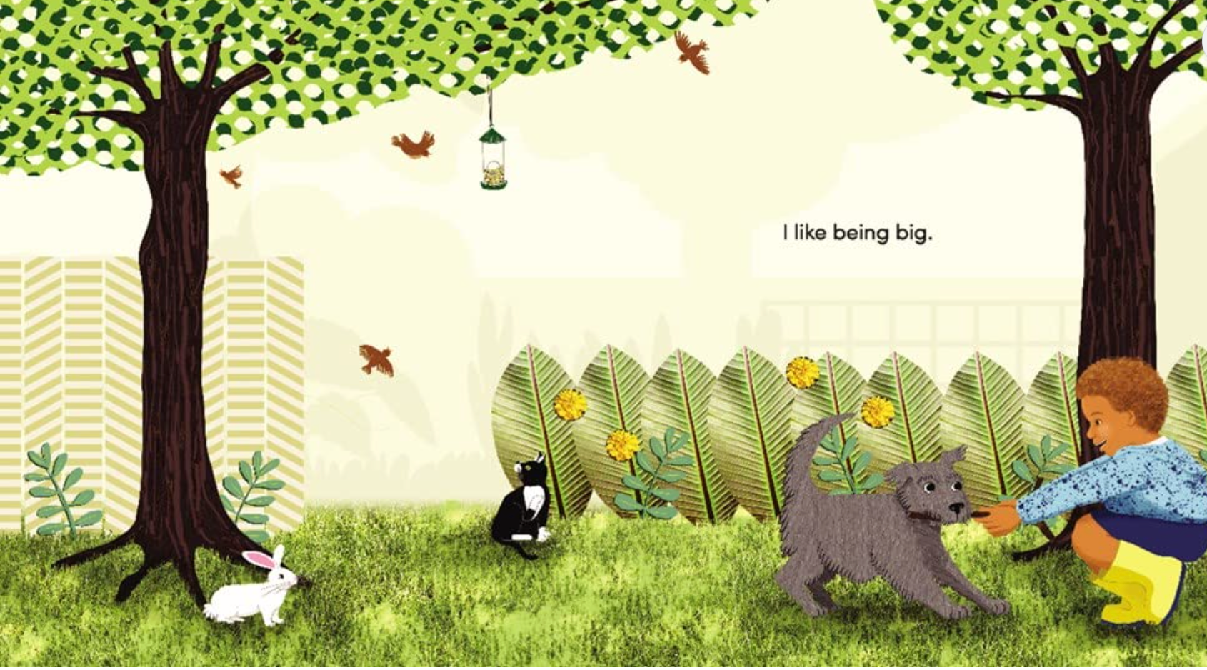 Time to play outside! It’s easy for a young boy to feel small in a world that is made up of big, big things. But when he takes a closer look, he discovers that he is big, too. His dog is smaller than he is, and his cat is smaller than his dog. And the teeny-tiny ant crawling through the grass? Even smaller!