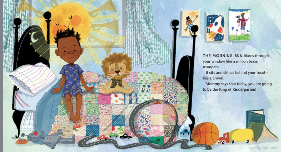 The morning sun blares through your window like a million brass trumpets.It sits and shines behind your head--like a crown. Mommy says that today, you are going to be the King of Kindergarten!
