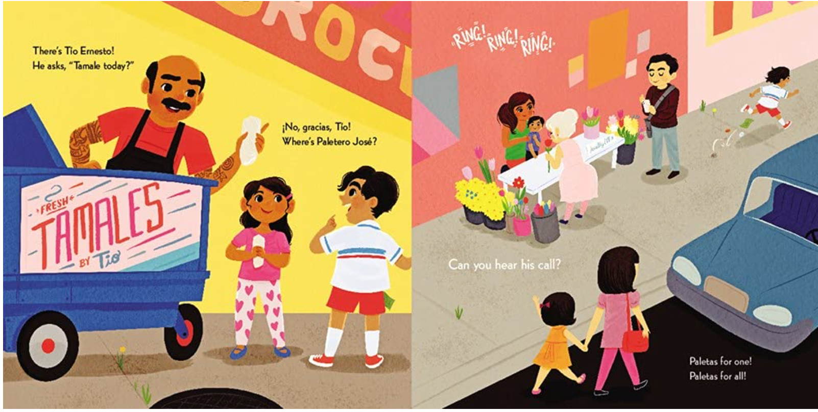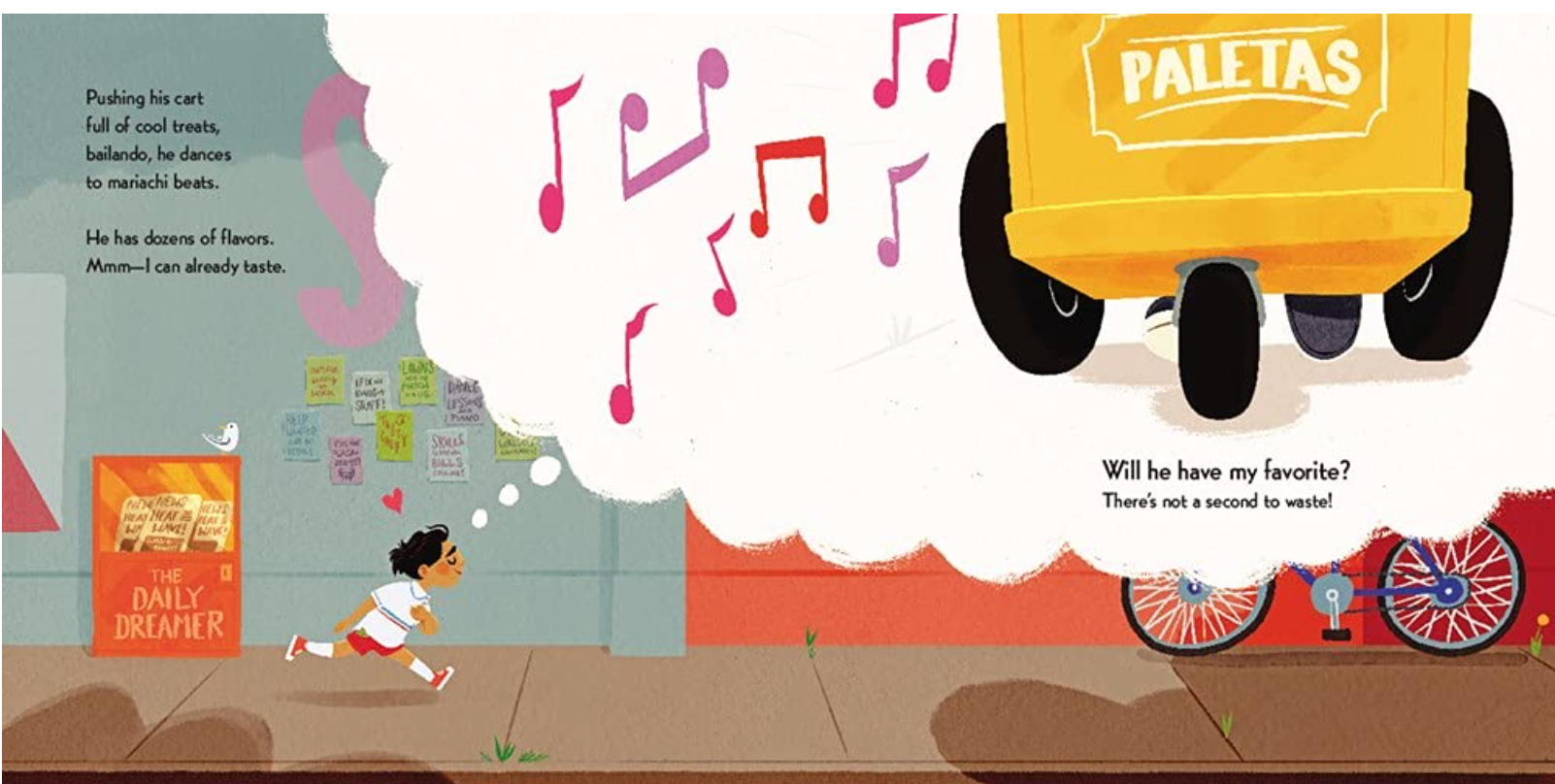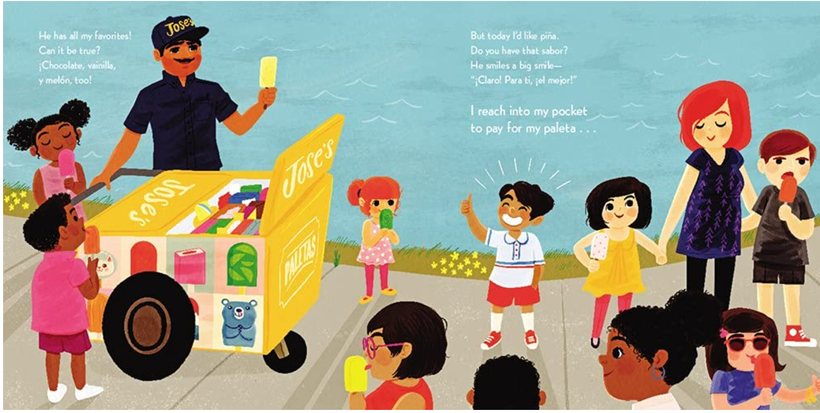 Follow along with our narrator as he passes through his busy neighborhood in search of the Paletero Man. But when he finally catches up with him, our narrator's pockets are empty. Oh no! What happened to his dinero? It will take the help of the entire community to get the tasty treat now.